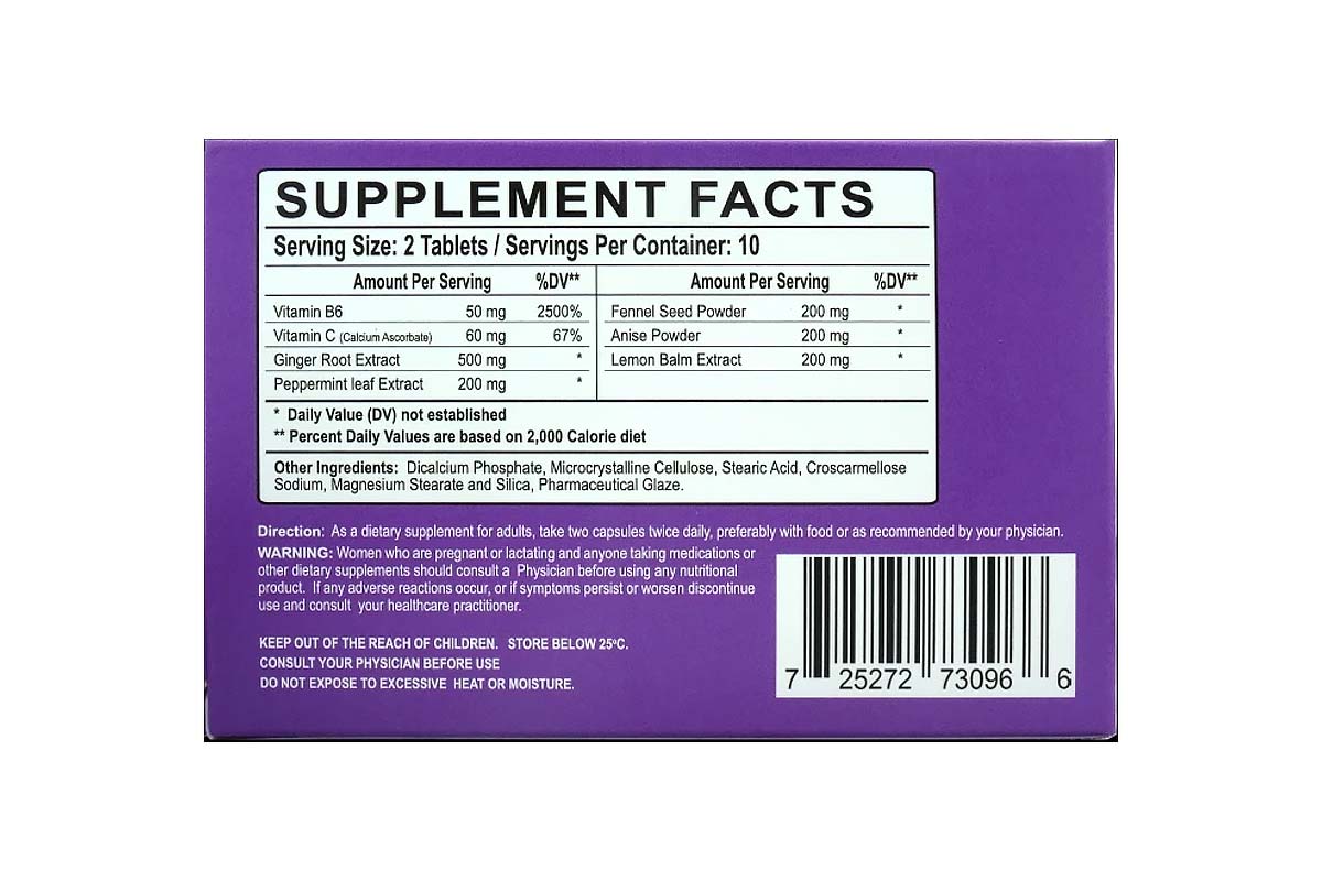 Vitamin B6, Vitamin C, Ginger Root Extract, Peppermint Leaf Extract, Fennel Seed Powder, Anise Powder, Lemon Balm Extract